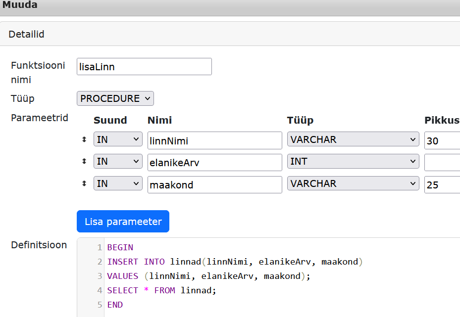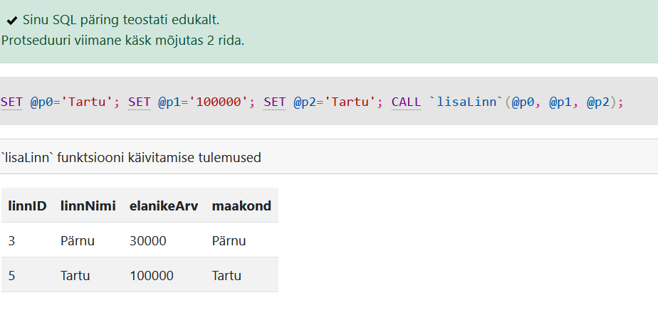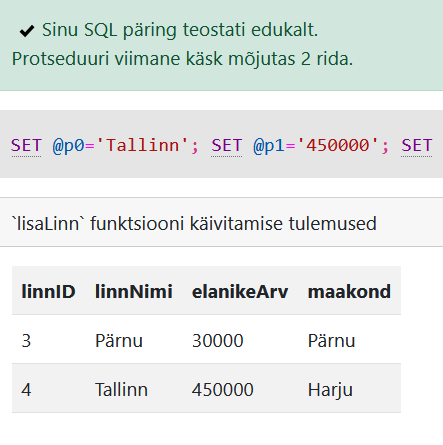EXEC lisaLinn 'Keila' , 1000, 'Harju';