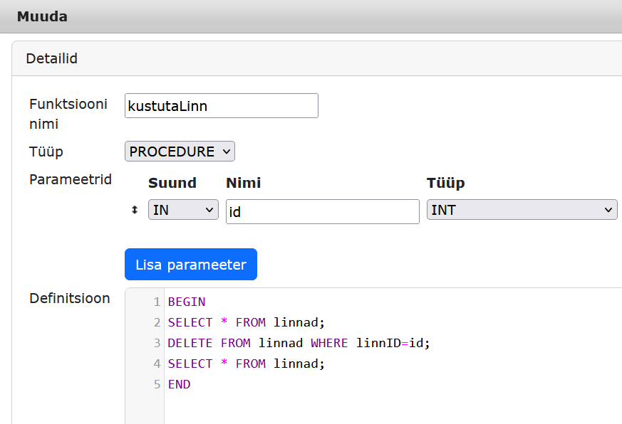 -- protseduur, mis kustutab tabelist id järgi