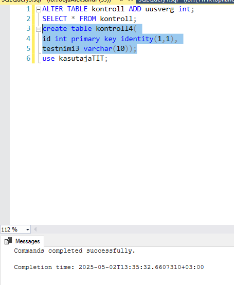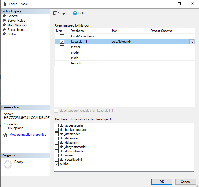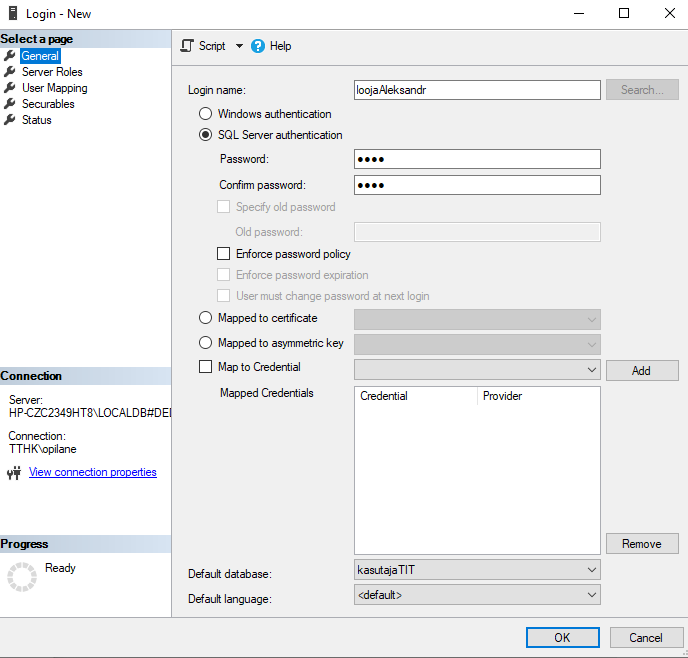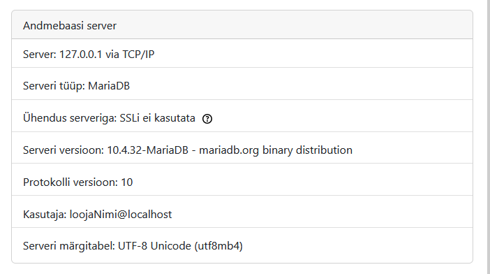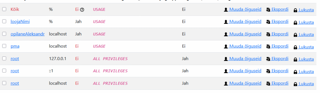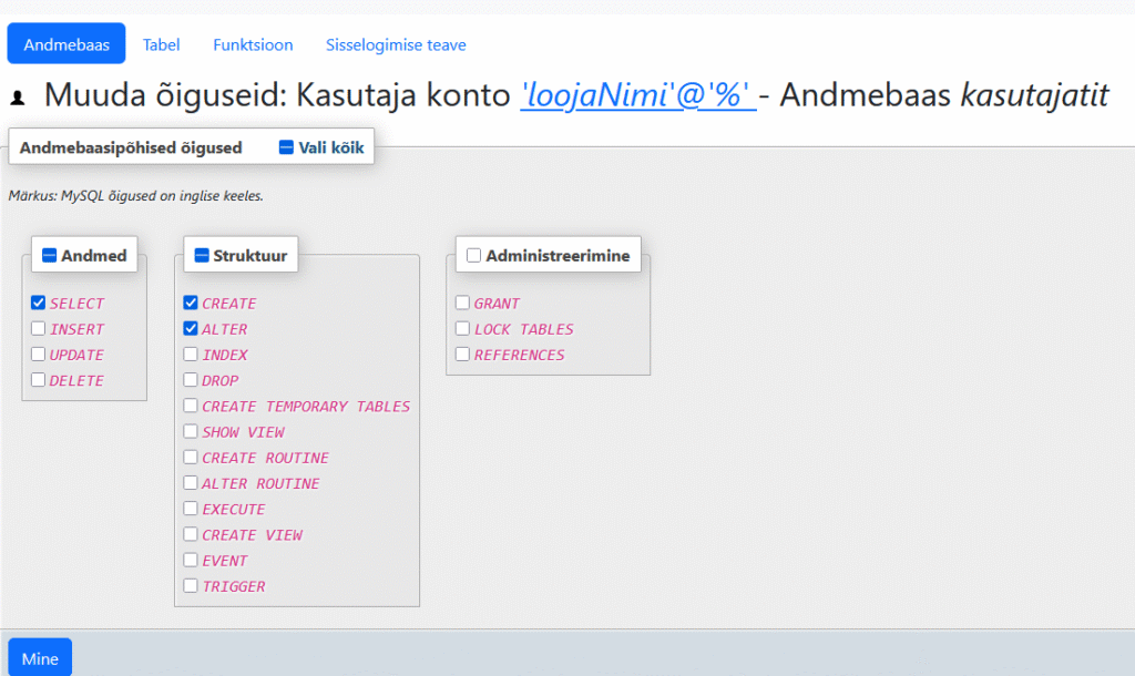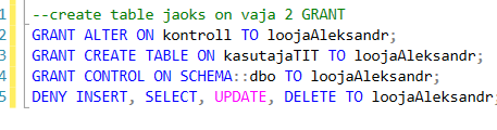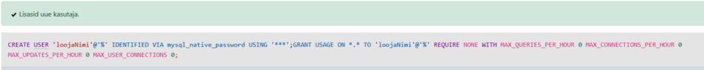 1. Создать пользователя loojaNimi (cоздатель) с паролем 123456 и правом создания новых таблиц CREATE TABLE и изменения структуры таблиц ALTER TABLE, например добавления нового поля в таблицу.