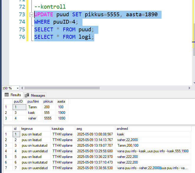 'uus puu info - ', inserted.puuNimi, ',' ,inserted.pikkus, ',' ,inserted.aasta)